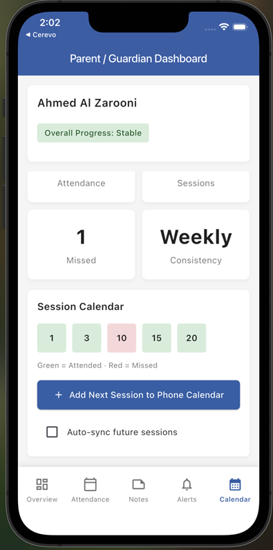 One app for the complete workflow: Sessions, notes, attendance, caregiver updates, and program monitoring in a single platform.