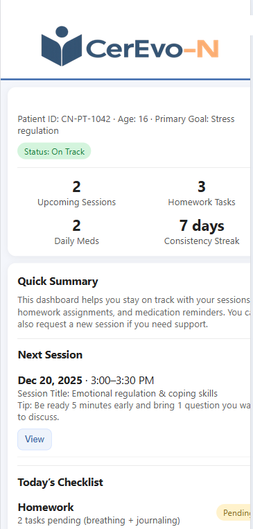 Cerevo-N enables clinics, therapists, and care teams to coordinate programs, sessions, caregivers, and patients through a structured, role-based system.