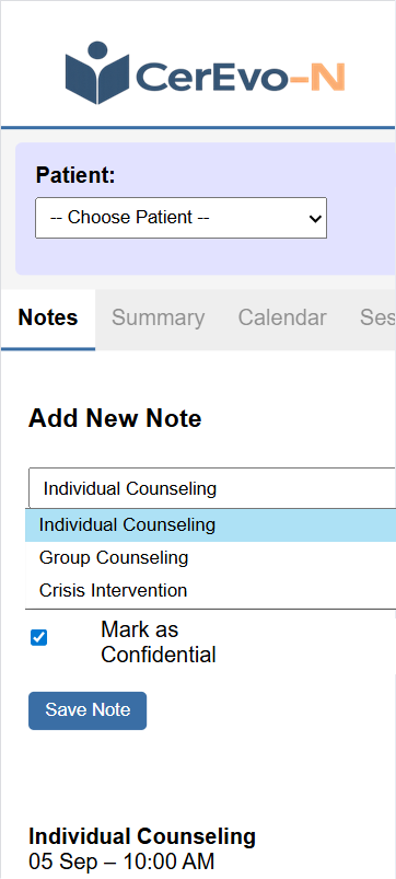 Clear separation of views for Counselors, Direct staff, Caregivers, and Patients. Each role sees only what is relevant to their responsibilities. Sensitive notes remain restricted by default and can be marked as confidential by the Counselor.